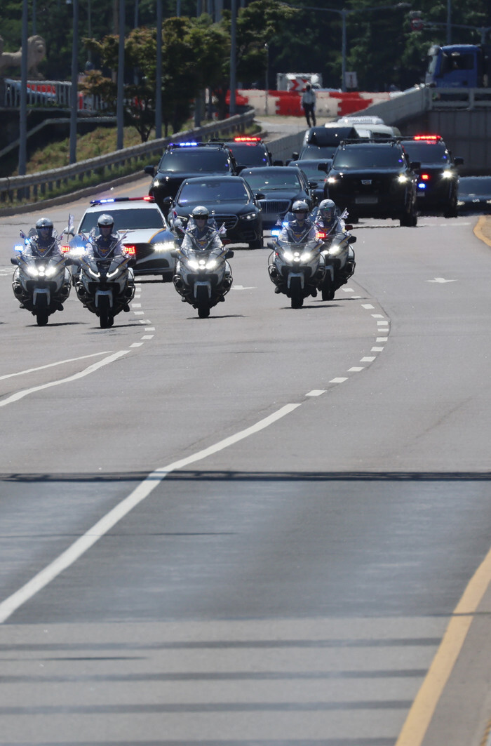 A motorcade carrying newly elected President Lee Jae-myung drives on a road in Seoul on June 4, 2025, on his way to his inauguration ceremony at the National Assembly in the capital. (Yonhap)