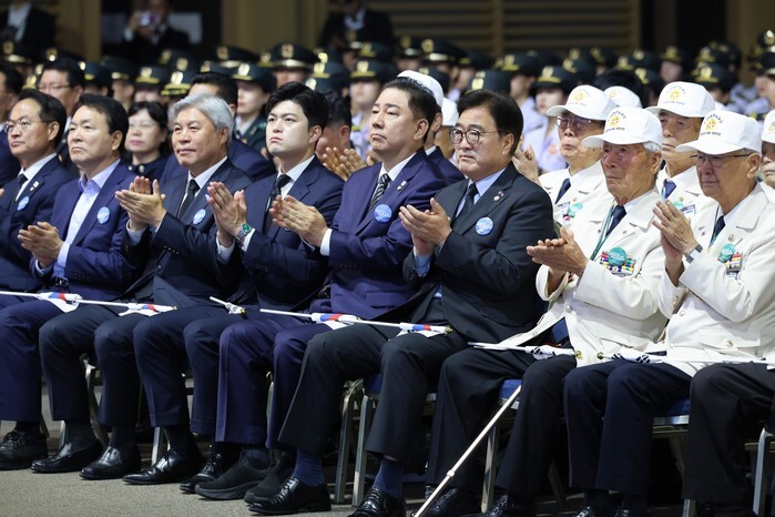 National Assembly Speaker Woo Won-shik (6th from L) and South Korea's political leaders take part in a ceremony in the central city of Daejeon on June 25, 2025, to commemorate the 75th anniversary of the outbreak of the 1950-53 Korean War. (Yonhap)