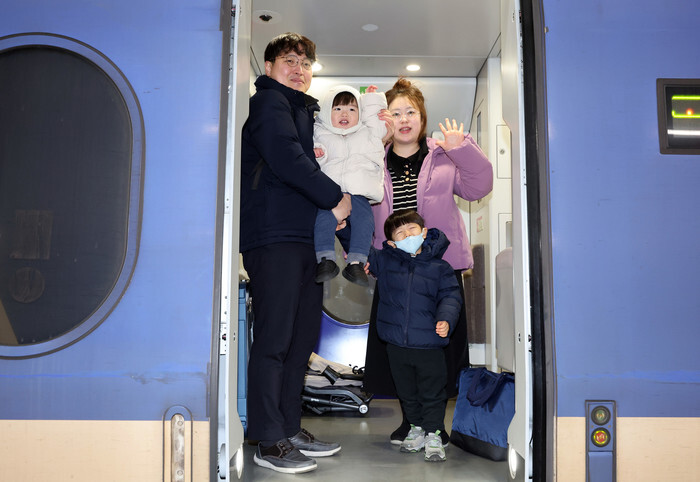 A family of four on a homebound trip boards a train at Seoul Station on Jan. 24, 2025, the eve of a six-day break for Seol, Lunar New Year's Day. The holiday, which runs from Jan. 25-30 this year, is a time for family reunions, with Koreans traditionally offering a ritual feast to their ancestors. (Yonhap)