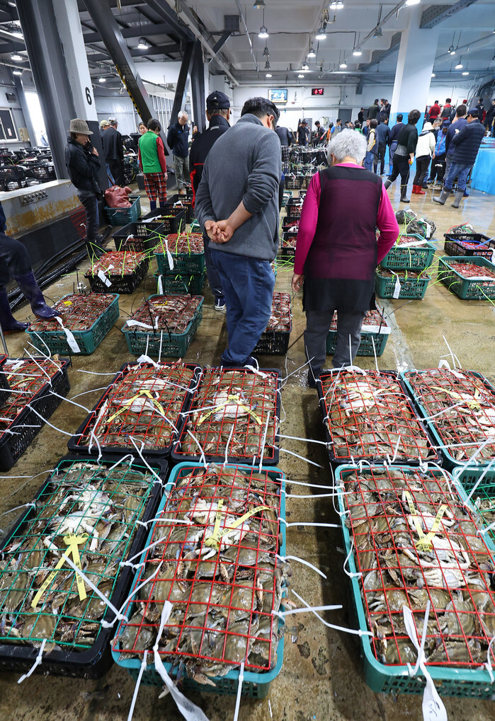 A group of licensed auctioneers takes part in an auction of crabs in crates at a cooperative fish market in Incheon, west of Seoul, on May 13, 2025, amid a sharp decrease in the amount of crabs caught in waters off Yeonpyeong Island located close to the inter-Korean sea border in the Yellow Sea. (Yonhap)
