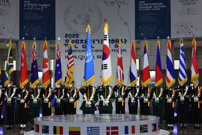 The national flags of South Korea and the other nations that participated in the 1950-53 Korean War on the South's side are held up at the opening ceremony of the U.N. Participation Memorial Festival at the War Memorial of Korea in central Seoul on Oct. 25, 2025, in this photo provided by the Korea War Memorial Organization. (PHOTO NOT FOR SALE) (Yonhap)