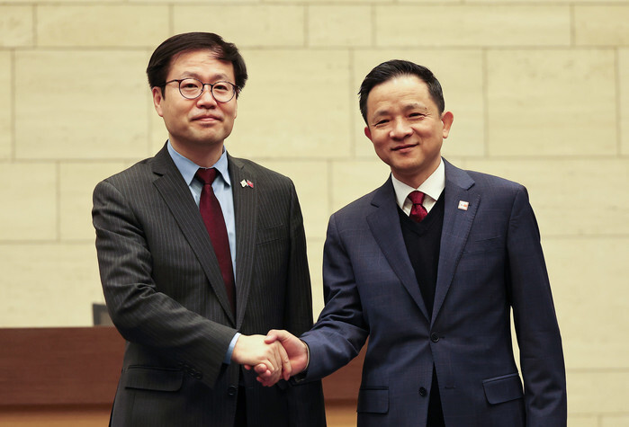 South Korean Trade Minister Yeo Han-koo (L) and Chinese Ambassador to South Korea Dai Bing shake hands during a seminar marking the 10th anniversary of a free trade agreement between the two countries at the headquarters of the Korea Chamber of Commerce and Industry in Seoul on Dec. 26, 2025. (Yonhap)