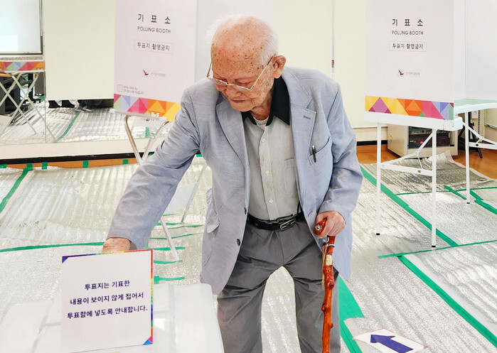 Baek Sam-bong, a 104-year-old voter, casts his ballot in the presidential election at a polling station in the southwestern city of Gwangju on June 3, 2025, in this provided photo. (PHOTO NOT FOR SALE) (Yonhap)