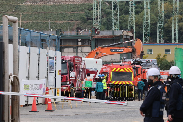 Search and rescue efforts are under way to locate two missing workers from the collapsed boiler tower at a thermal power plant in the southeastern city of Ulsan on Nov. 8, 2025. (Yonhap)