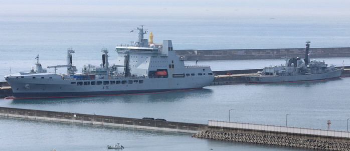 Two British naval vessels -- the frigate HMS Richmond (R) and the logistical support ship RFA Tidespring -- are anchored at a naval base in the southeastern port city of Busan on Aug. 13, 2025. The warships have arrived in South Korea as part of a regional tour aimed at enhancing security cooperation in the Indo-Pacific. (Yonhap)