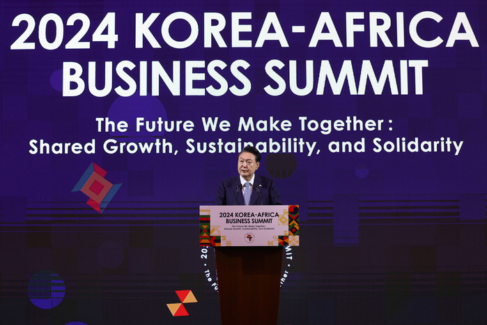 South Korean President Yoon Suk Yeol delivers a keynote speech during the 2024 Korea-Africa Business Summit at Lotte Hotel in Seoul on June 5, 2024. (Yonhap)