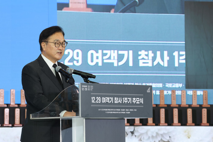 National Assembly Speaker Woo Won-shik delivers a eulogy during a memorial ceremony at Muan International Airport, southwestern South Korea, on Dec. 29, 2025, the first anniversary of a Jeju Air passenger plane crash that claimed 179 people's lives. (Yonhap)