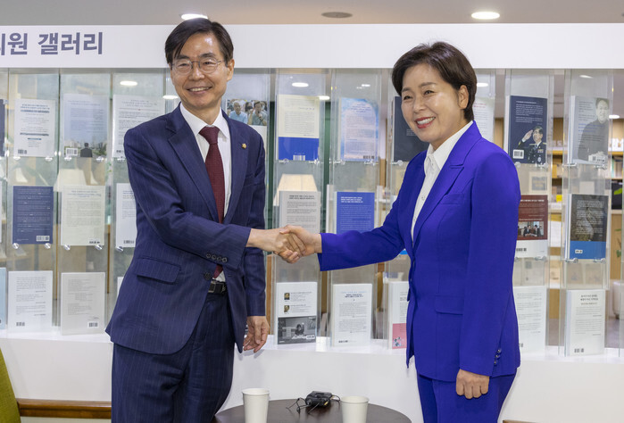 Cho Kyoung-tae (L), a lawmaker of the main opposition People Power Party, and the party's former lawmaker Yang Hyang-ja -- both candidates in the party's leadership race -- shake hands during their meeting at the National Assembly in Seoul on July 31, 2025, ahead of the leadership election on Aug. 22. (Yonhap)