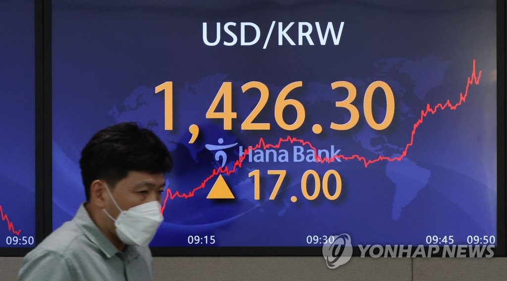 | ▲ This photo, taken Sept. 26, 2022, shows the South Korean currency sliding below the 1,420-won mark against the U.S. dollar for the first time in more than 13 years during intraday trading. (Yonhap) |