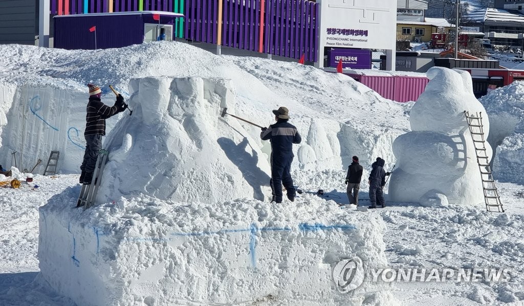 | ▲ 대관령눈꽃축제 준비 한창 (평창=연합뉴스) 유형재 기자 = 대관령눈꽃축제 개막을 이틀 앞둔 18일 강원 평창군 대관령면 송천 일원에서 대형 눈 조각이 한창이다. 2023.1.18 yoo21@yna.co.kr |