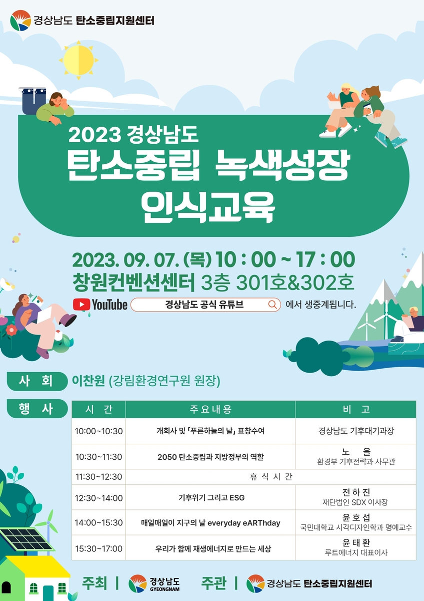 (창원=연합뉴스) 경남도와 경남도 탄소중립지원센터는 오는 7일 창원컨벤션센터에서 도와 시·군 공무원, 기업, 도민 등을 대상으로 '2023년 탄소중립·녹색성장 인식교육'을 한다고 5일 밝혔다.
