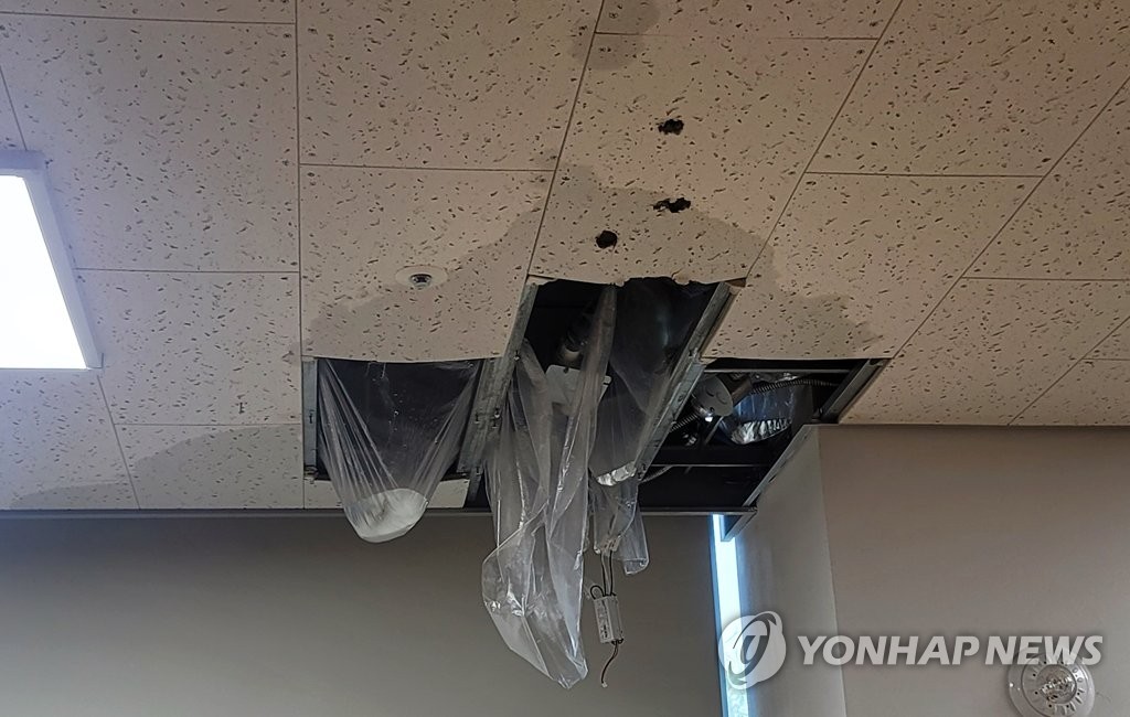 | ▲ 누수 발생한 광주 서빛마루센터 (광주=연합뉴스) 지난 27일 오후 광주 서구 서빛마루센터 4층에서 누수 현상이 발생했다. 사진은 빗물에 젖은 천장 면이 허물어진 모습. 2023.6.29 [독자 제공. 재판매 및 DB 금지] daum@yna.co.kr |