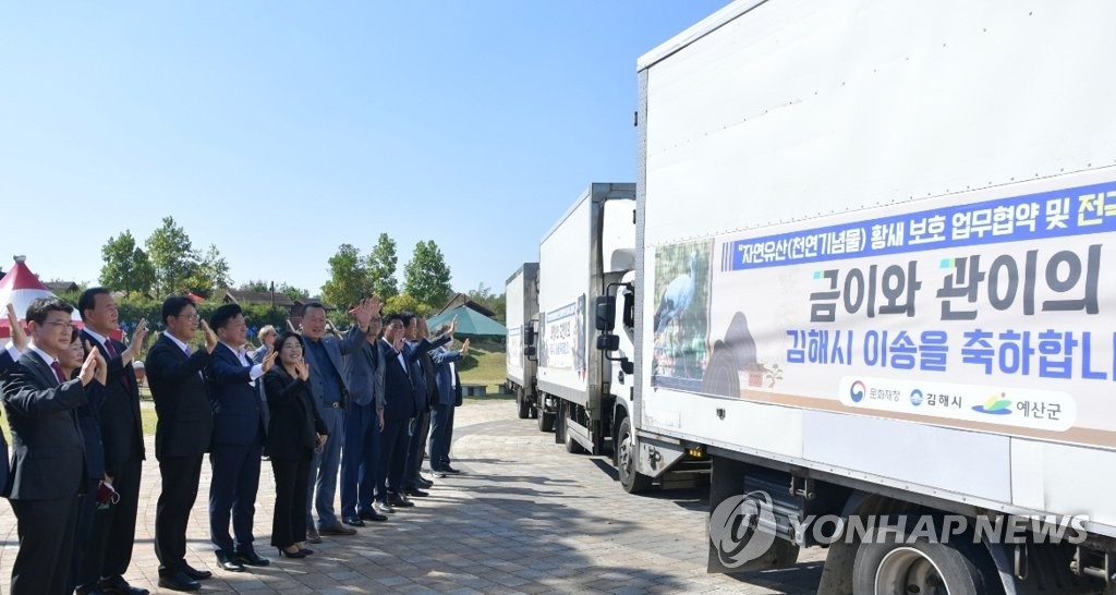 | ▲ 김해로 오는 황새 금이와 관이 (김해=연합뉴스) 문화재청과 충남 예산군이 지난달 30일 예산황새공원에서 경남 김해시, 충북 청주시, 충남 서산시와 함께 '황새보호 업무협약'을 체결하고 황새 부부 3쌍을 각 지역 방사장으로 보냈다. 사진 왼쪽부터 최응천 문화재청장, 홍태용 김해시장, 최재구 예산군수. [김해시 제공. 재판매 및 DB 금지] seaman@yna.co.kr |