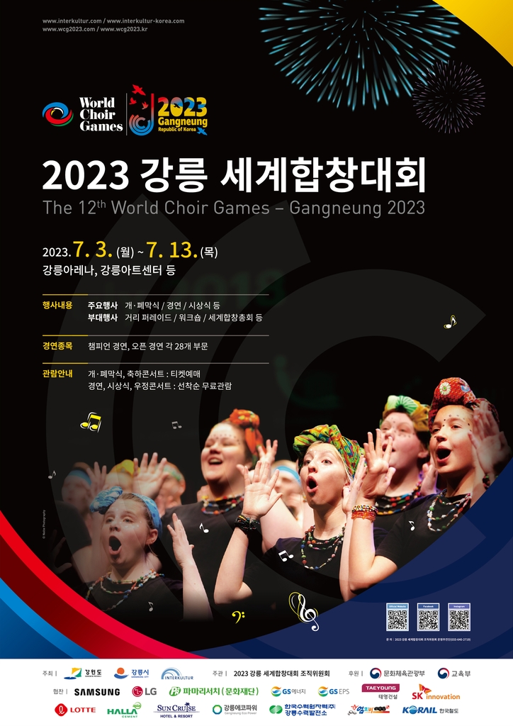 2023 강릉 세계합창대회는 7월 3일부터 13일까지 강릉아레나, 강릉아트센터 등에서 펼쳐지며 합창단 경연, 거리 퍼레이드, 우정 콘서트, 축하 콘서트 등 다양한 볼거리를 제공한다.