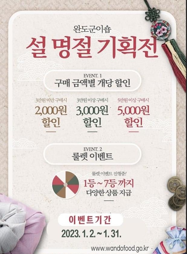 완도군 대표 온라인 쇼핑몰인 '완도군이숍'은 설 명절 이벤트로 구매 개수 당 최대 5천원을 할인하고 2만 원 이상 무료 배송을 하는데 이벤트 기간을 31일까지 열흘 연장한다.