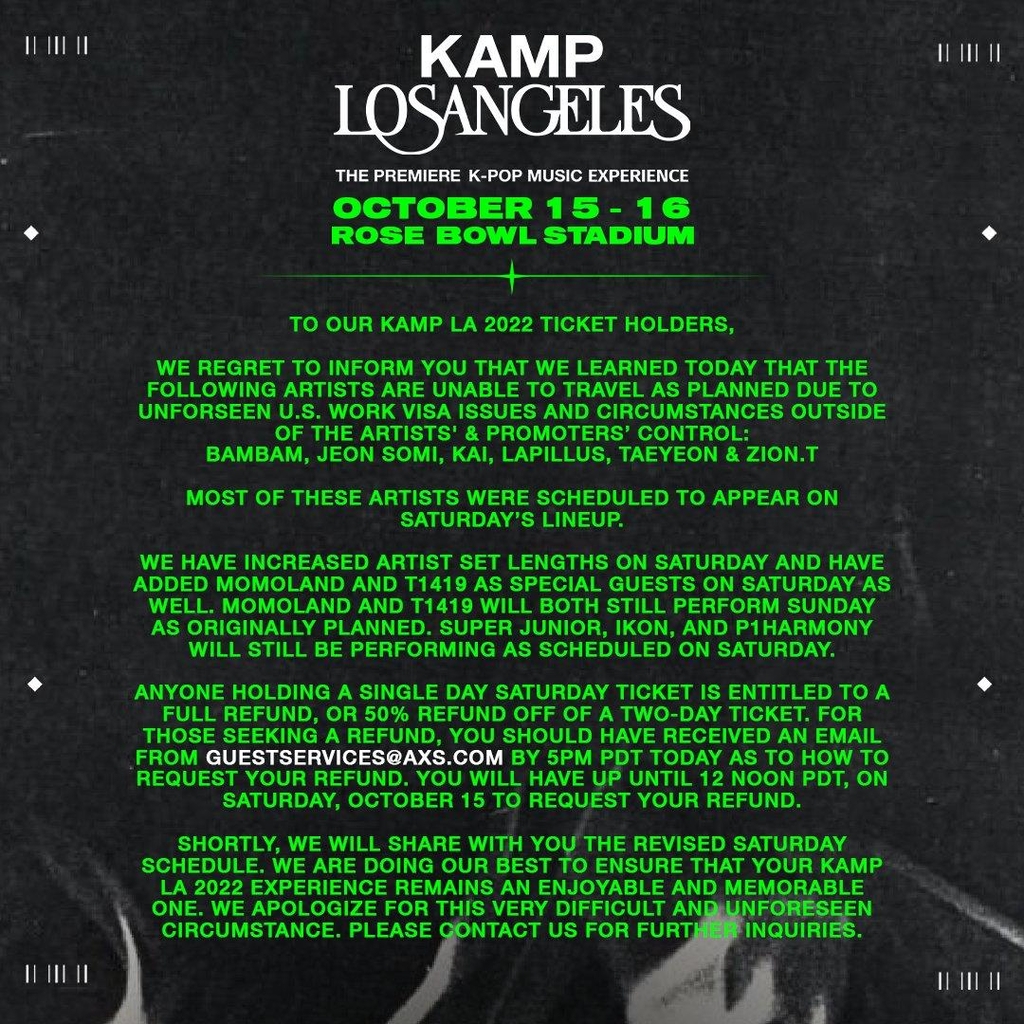 "We regret to inform you that we learned today that the following artists are unable to travel as planned due to unforeseen U.S. work visa issues and circumstances outside of the artists' and promoters' control," KAMP Global said in a statement released online.