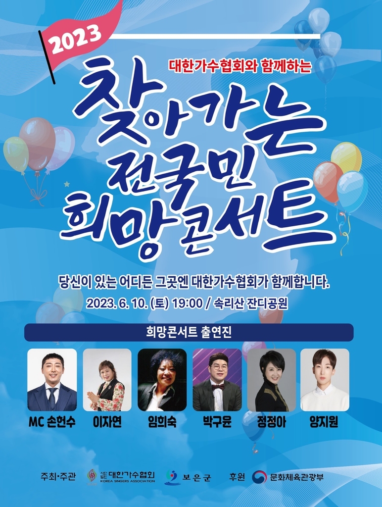 ▲ 속리산서 '찾아가는 희망콘서트' = 대한가수협회는 오는 10일 오후 7시 충북 보은군 속리산 잔디공원에서 '찾아가는 전 국민 희망콘서트'를 연다고 밝혔다.