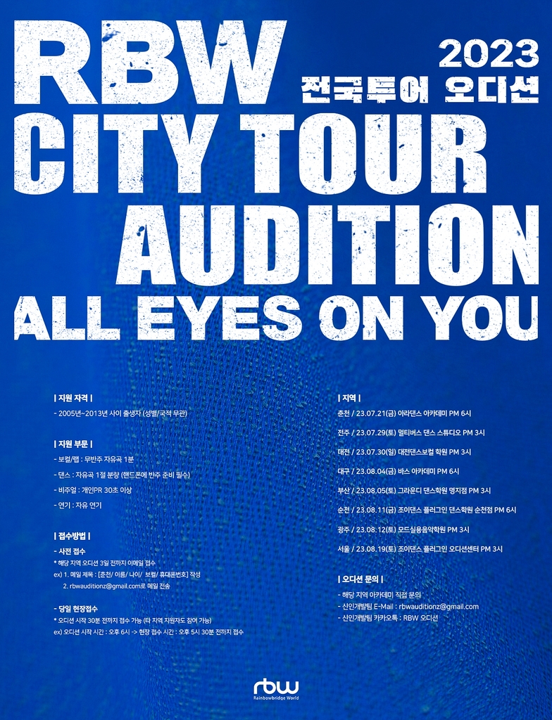 ▲ 알비더블유 전국투어 오디션 = 걸그룹 마마무와 그룹 원어스의 소속사 알비더블유는 다음 달 춘천을 시작으로 전주, 대전, 대구, 부산, 순천, 광주, 서울 8개 도시를 순회하는 전국투어 오디션을 연다고 밝혔다.
