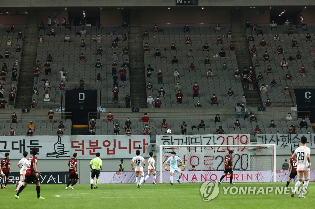 ▲ This file photo from Aug. 7, 2020, shows fans attending a K League 1 match between FC Seoul and Gangwon FC at Seoul World Cup Stadium in Seoul. (Yonhap)