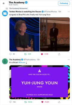 부문별 수상을 발표한 아카데미 시상식의 공식 트위터 계정(@TheAcademy)에서도 윤여정이 받은 여우조연상 트윗이 가장 많은 3만9천 건의 리트윗을 기록했다.