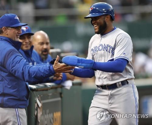 | ▲  In this EPA file photo from April 19, 2019, Socrates Brito of the Toronto Blue Jays (R) is greeted by bench coach Dave Hudgens after scoring against the Oakland Athletics during the top of the second inning of a Major League Baseball regular season game at Oakland Coliseum in Oakland, California. (Yonhap) |
