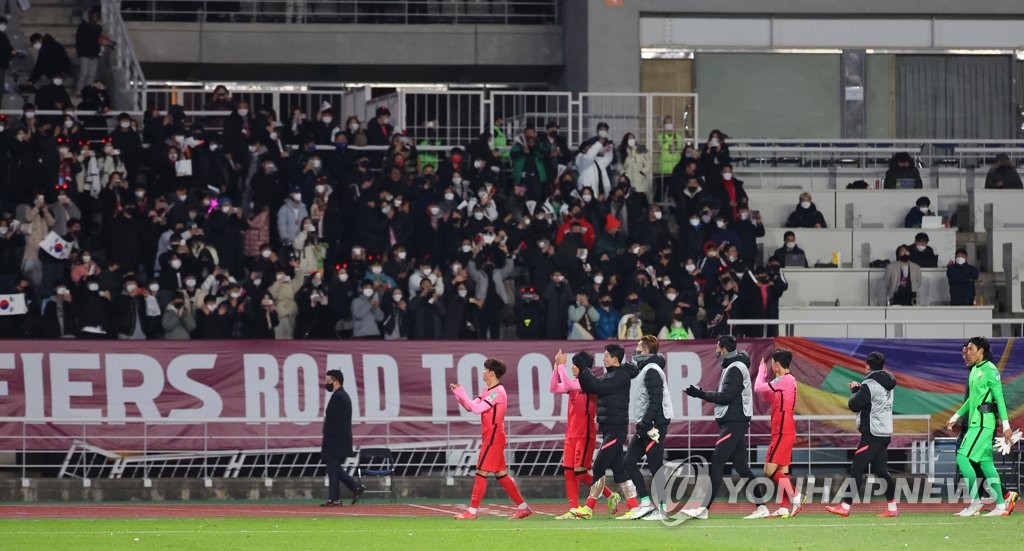 | ▲ In this file photo from Nov. 11, 2021, South Korean players salute the crowd after beating the United Arab Emirates 1-0 in the teams' Group A match in the final Asian qualifying round for the 2022 FIFA World Cup at Goyang Stadium in Goyang, Gyeonggi Province. (Yonhap) |