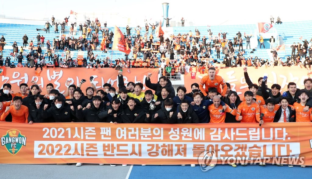 | ▲ In this file photo from Dec. 12, 2021, members of Gangwon FC celebrate their 4-1 victory over Daejeon Hana Citizen in the second leg of the K League promotion-relegation playoff at Gangneung Stadium in Gangneung, some 240 kilometers east of Seoul. (Yonhap) |