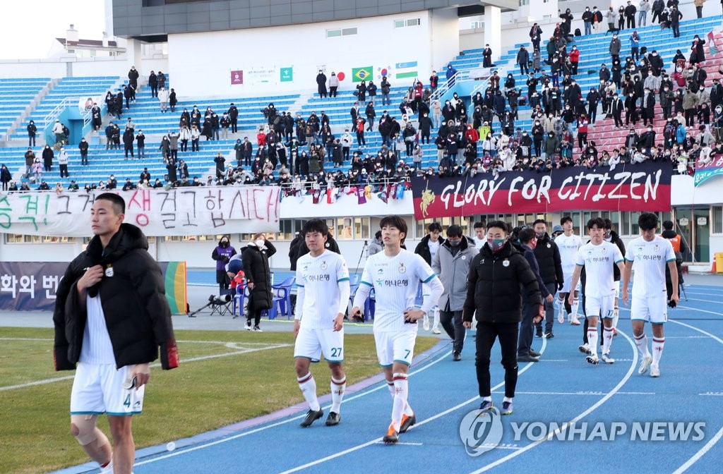 | ▲ In this file photo from Dec. 12, 2021, members of Daejeon Hana Citizen walk off the pitch after losing to Gangwon FC 4-1 in the second leg of the K League promotion-relegation playoff at Gangneung Stadium in Gangneung, some 240 kilometers east of Seoul. (Yonhap) |