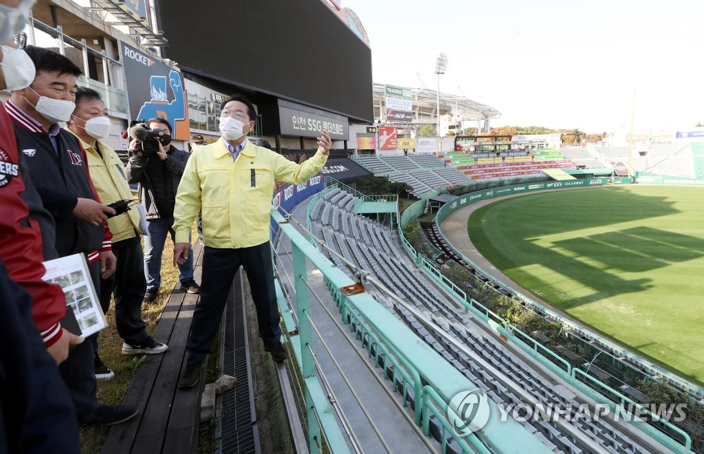 | ▲ Incheon Mayor Yoo Jeong-bok (R) goes over safety plans with baseball and city officials at Incheon SSG Landers Field in Incheon, some 30 kilometers west of Seoul, on Oct. 31, 2022, on the eve of Game 1 of the Korean Series between the SSG Landers and the Kiwoom Heroes. (Yonhap) |