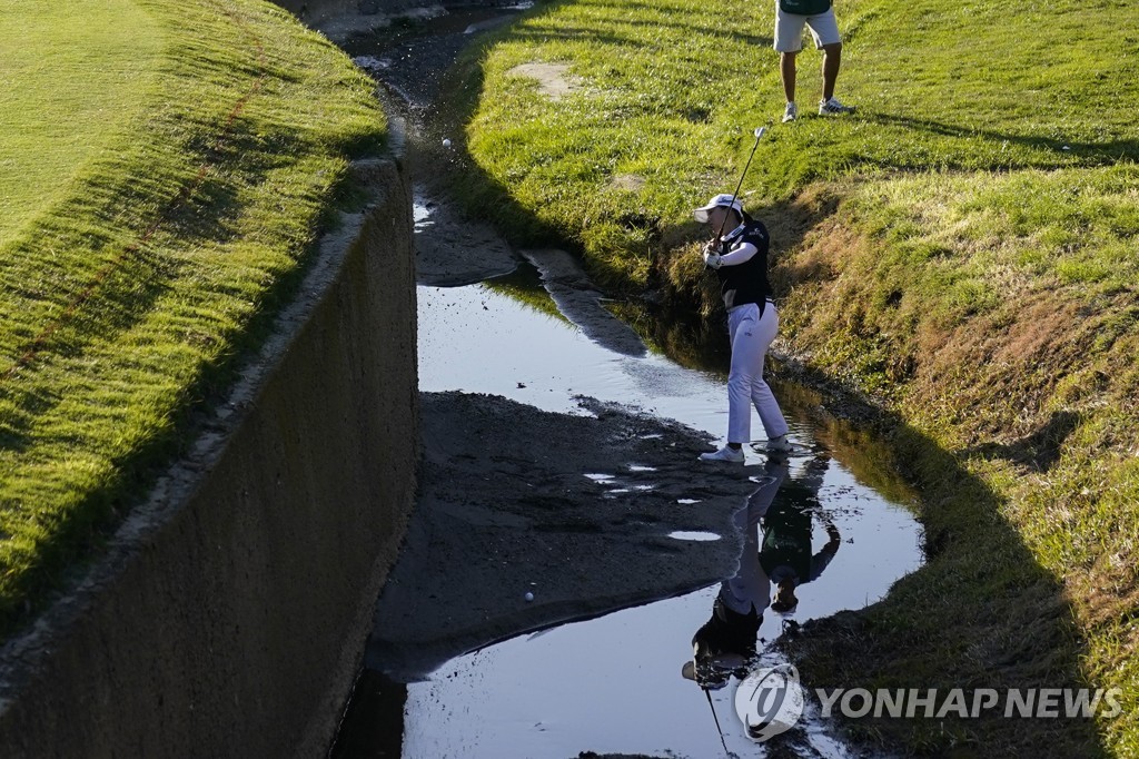 고진영은 이어진 17번 홀(파4)에선 두 번째 샷이 왼쪽 페널티 구역에 빠져 더 큰 위기에 놓였다.