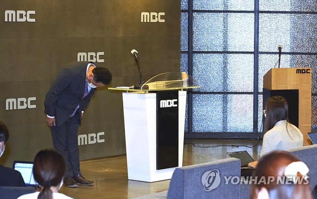 | ▲ 대국민 사과하는 박성제 MBC 사장 (서울=연합뉴스) 박성제 MBC 사장이 26일 오후 서울 마포구 상암동 MBC에서 열린 기자회견에서 개회식과 남자 축구 중계 등에서 벌어진 그래픽과 자막 사고 등에 대해 대국민 사과를 하고 있다. 2021.7.26 [MBC 제공. 재판매 및 DB 금지] photo@yna.co.kr |