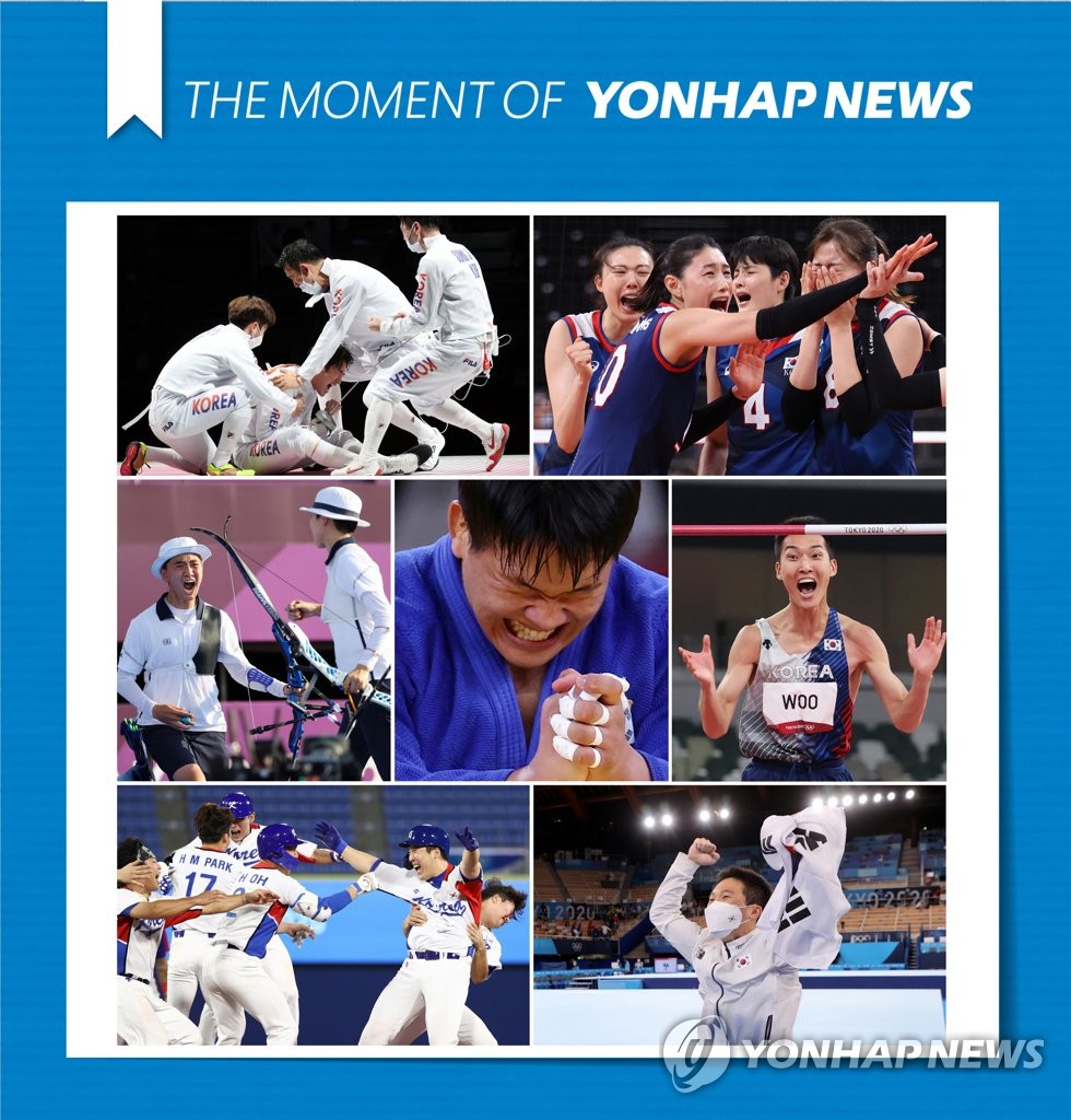 | ▲ [모멘트] 환호의 순간들 (도쿄=연합뉴스) 특별취재단 = 희망이었고 기쁨이었다. 코로나19 팬데믹 상황에 무관중 경기로 치러진 2020도쿄올림픽이지만 태극전사들의 열정과 도전은 그 어느 올림픽보다 치열했다. 그 치열함 끝에 얻어낸 값진 승리는 팬데믹 상황에 힘들어하는 국민들에게 희망이 되고 위안이 되었다. 한국 선수들의 땀과 눈물이 이뤄낸 환호의 모습을 모았다. 남자 에페 단체전 동메달(위 왼쪽부터 시계방향으로), 여자배구 터키전 승리, 높이뛰기 우상혁, 도마 신재환 금메달 획득, 야구 도미니카전 역전 끝내기, 양궁 혼성 안산ㆍ김제덕의 금메달. 가운데는 유도 은메달의 조구함. 2021.8.5 [THE MOMENT OF YONHAPNEWS] photo@yna.co.kr |