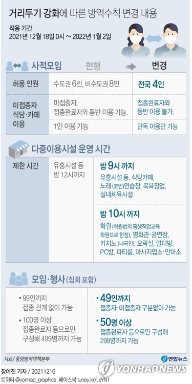 | ▲ [그래픽] 거리두기 강화에 따른 방역수칙 변경 내용 (서울=연합뉴스) 장예진 기자 = 코로나19 유행이 걷잡을 수 없는 수준으로 확산하면서 일상회복이 일시 중단되고 다시 고강도 사회적 거리두기 조치가 시행된다. jin34@yna.co.kr 페이스북 tuney.kr/LeYN1 트위터 @yonhap_graphics |
