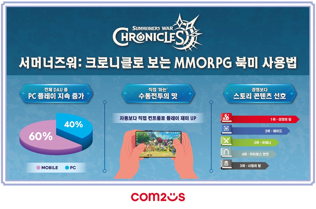 컴투스에 따르면 지난 11월 10일부터 30일까지 약 3주간 북미 지역 '서머너즈워: 크로니클' 이용자들은 혼자 즐기는 성장·스토리텔링 콘텐츠를 가장 많이 즐긴 것으로 나타났다.