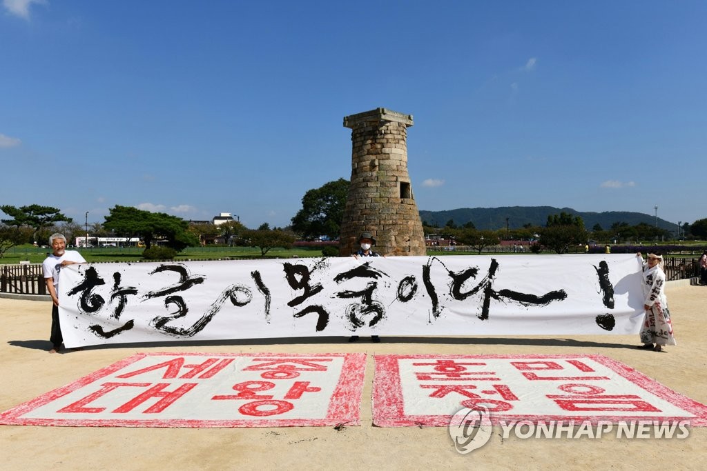 | ▲ "한글이 목숨이다" (경주=연합뉴스) 7일 경북 경주 첨성대 앞에서 서예가 김동욱 씨와 이희숙 한국 고 살풀이춤 보존회장이 575돌 한글날을 앞두고 붓글씨를 쓰면서 춤을 추는 행위예술을 하고 있다. 2021.10.7 [김동욱씨 제공. 재판매 및 DB 금지] sds123@yna.co.kr |