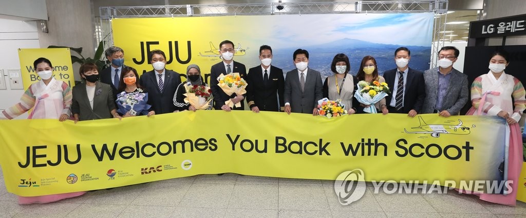 이날 오전 1시 35분 관광객 201명을 태워 만석으로 싱가포르 창이국제공항을 출발한 스쿠트항공 TR812편이 오전 8시 45분께 제주국제공항에 도착했다.