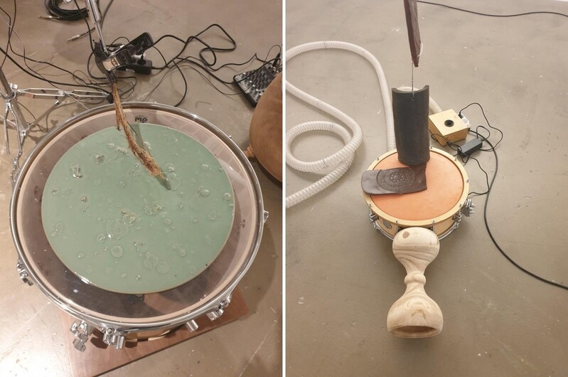 아투이는 2019년부터 한국을 찾으며 전통 악기뿐만 아니라 청자, 옹기, 한지, 짚 등을 탐구했다. 이 과정에서 서인석 악기장, 정희창 옹기장, 강지향 도예가 등과 협업한 결과물들이 이번 전시에서 새로운 악기로 탄생했다.