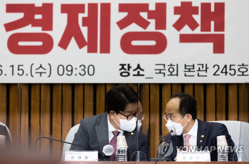 | ▲ Finance Minister Choo Kyung-ho (R) speaks with Rep. Kweon Seong-dong, the floor leader of the ruling People Power Party, during a party-government consultative meeting on economy policy at the National Assembly in Seoul on June 15, 2022. (Pool photo) (Yonhap) |