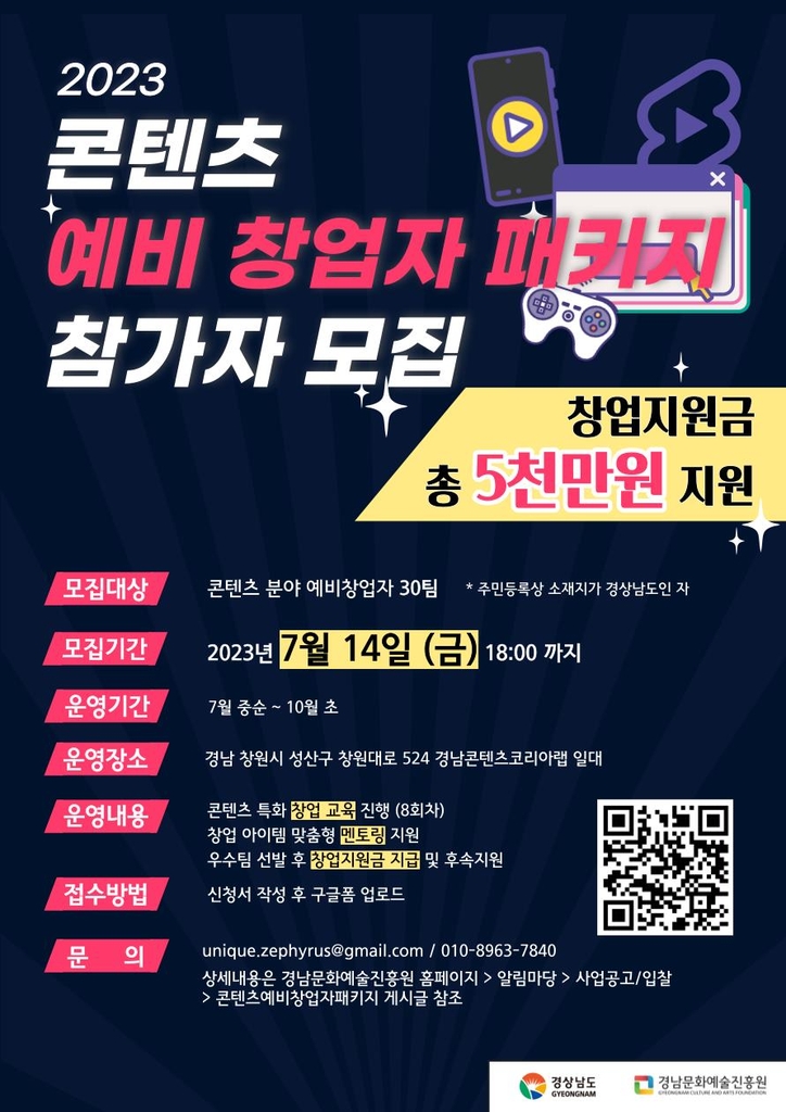 (창원=연합뉴스) 황봉규 기자 = 경남도는 도내 문화콘텐츠 분야 창업 활성화를 위해 예비 창업자를 밀착 지원하는 '2023년 예비 창업자 패키지 지원사업'을 한다고 30일 밝혔다.