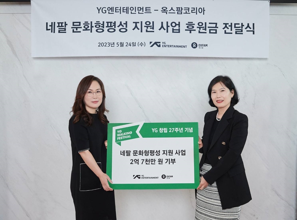 YG는 전날 서울 마포구 신사옥에서 황보경 공동대표와 지경영 옥스팜코리아 대표가 참석한 가운데 기부금 전달식을 열었다. 이 기부금은 네팔 소수민족과 소외 계층 청소년의 문화 형평성 제고와 디지털 역량 강화 교육에 쓰인다.