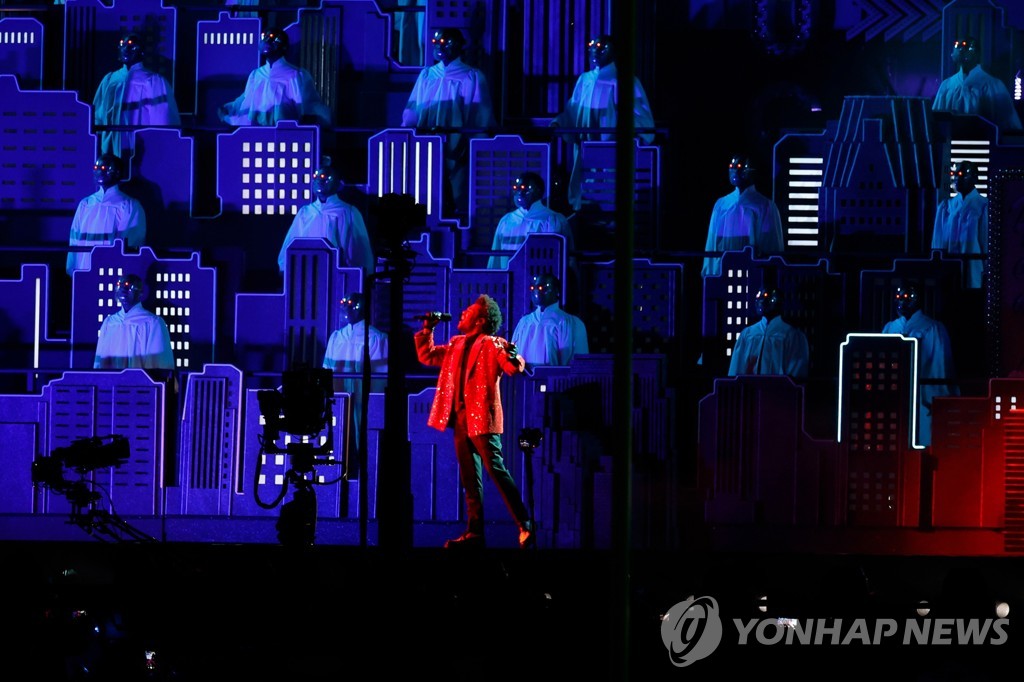 (서울=연합뉴스) 오보람 기자 = 팝스타 위켄드가 신종 코로나바이러스 감염증(코로나19) 대유행 속에 치러진 미국 슈퍼볼의 하프타임 쇼를 화려하게 장식했다.