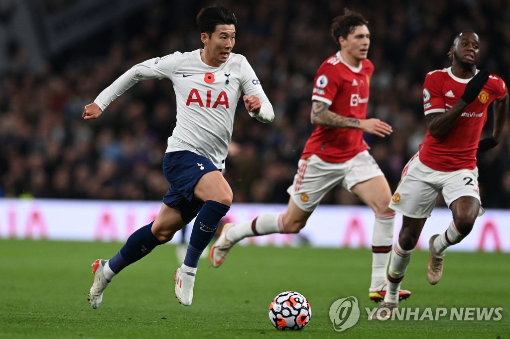 | ▲ In this AFP photo, Son Heung-min of Tottenham Hotspur (L) runs with the ball during a Premier League match against Manchester United at Tottenham Hotspur Stadium in London on Oct. 30, 2021. (Yonhap) |