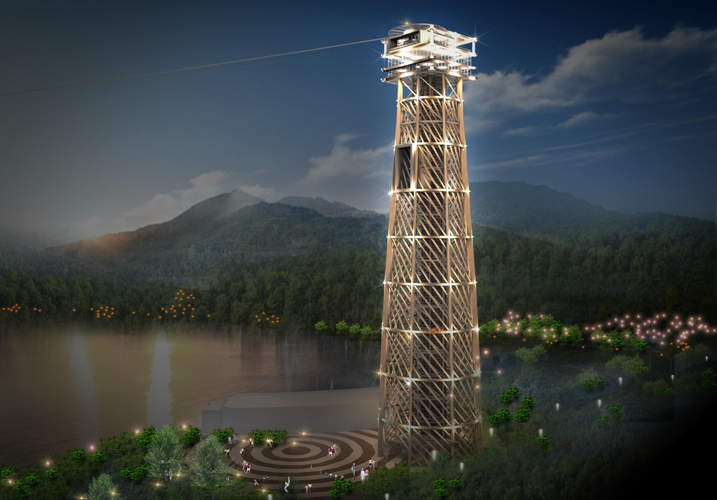 타워는 짚라인 탑승장뿐만아니라 엣지워크 체험, 전망대, 카페 등 복합공간으로 구성된다.