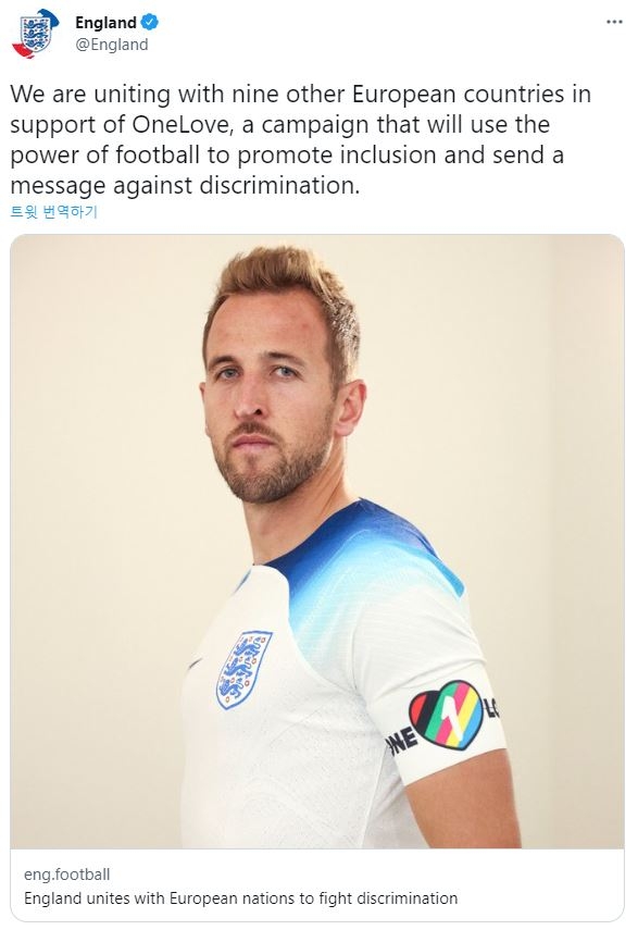 영국 BBC는 21일(이하 현지시간) "케인이 유럽축구연맹(UEFA) 네이션스리그와 카타르 월드컵에서 '원 러브'(One Love) 완장을 착용한다"고 전했다.