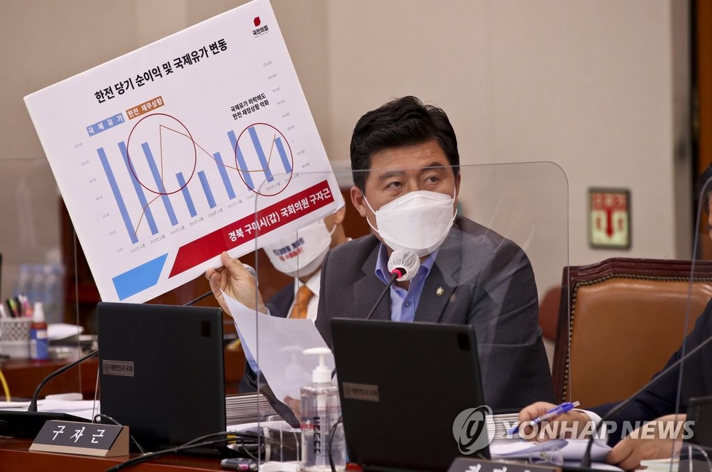 | ▲ 질의하는 국민의힘 구자근 의원 (서울=연합뉴스) 안정원 기자 = 국민의힘 구자근 의원이 지난 12일 서울 여의도 국회에서 열린 산업통상자원중소벤처기업위원회의 한국전력공사, 한국수력원자력 등에 대한 국정감사에서 전기요금 인상 관련 질의를 하고 있다. 2021.10.12 [국회사진기자단] jeong@yna.co.kr |