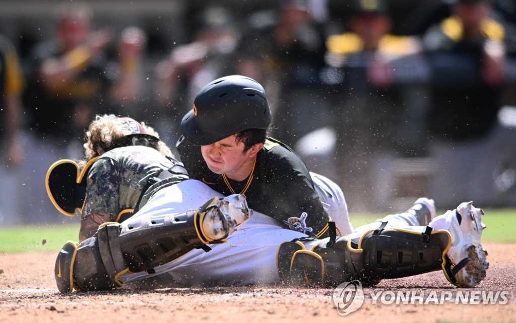 | ▲ 30일(한국시간) 샌디에이고전에서 연장 10회 홈에 파고들다 아웃된 피츠버그 박효준 [AFP=연합뉴스] |