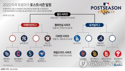 | ▲ [그래픽] 2022 미국 프로야구 포스트시즌 일정 (서울=연합뉴스) 김영은 기자 = 미국프로야구 메이저리그(MLB)가 6일(한국시간) 팀당 162경기 대장정을 마치고 8일 포스트시즌 일정을 시작한다. 0eun@yna.co.kr 트위터 @yonhap_graphics 페이스북 tuney.kr/LeYN1 |