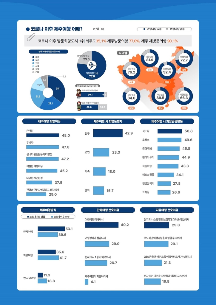 코로나19 이후 한국을 방문한다면 방문하고 싶은 도시로 '제주'가 35.1%로 가장 높았다.