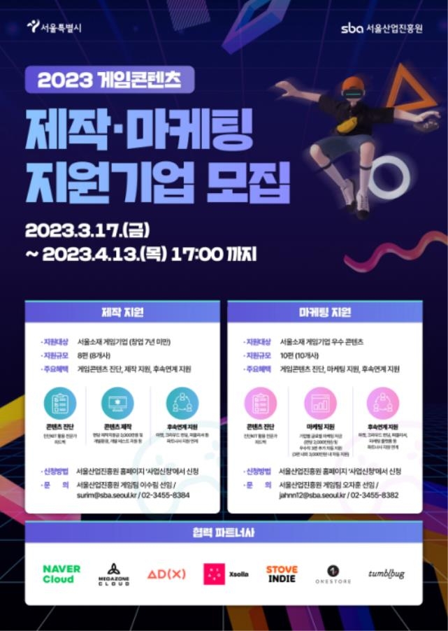 사업 관련 자세한 내용은 서울시 홈페이지(seoul.go.kr), 서울산업진흥원 홈페이지(sba.kr)에서 확인하거나 서울산업진흥원 게임팀(☎ 02-3455-8384(제작), ☎ 02-3455-8382(마케팅))으로 문의하면 된다.