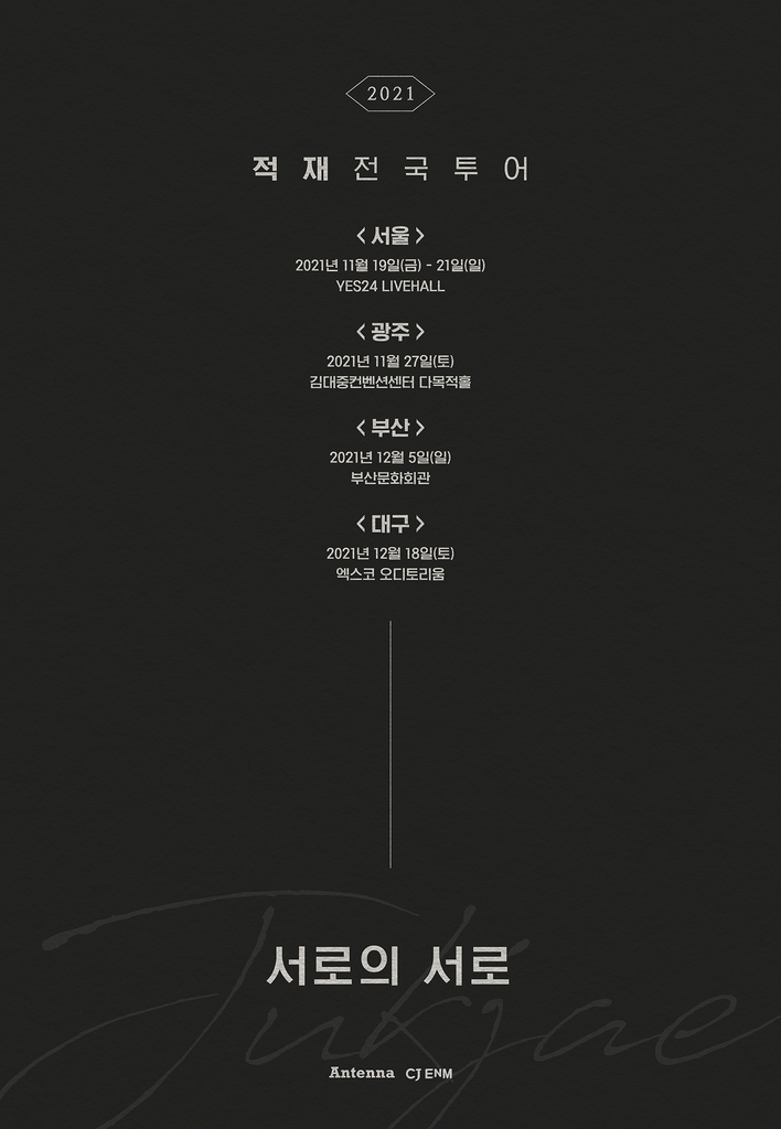 12일 소속사 안테나에 따르면 적재는 다음 달 19일 서울을 시작으로 광주, 부산, 대구 등 전국 4개 도시에서 투어 콘서트 '서로의 서로'를 개최한다.